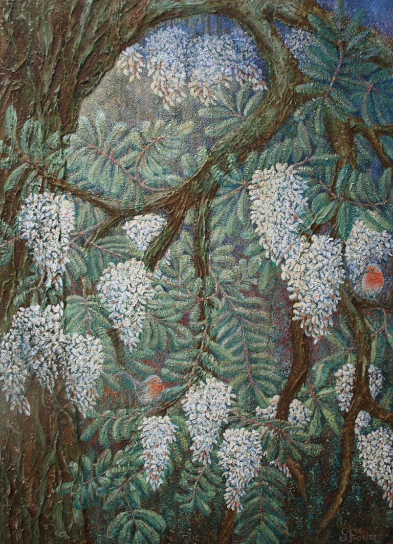 ROBINIENGEZWITSCHER 100 x 140 cm – Aqua Öl, Rost, Strukturpaste auf Leinwand – 2023